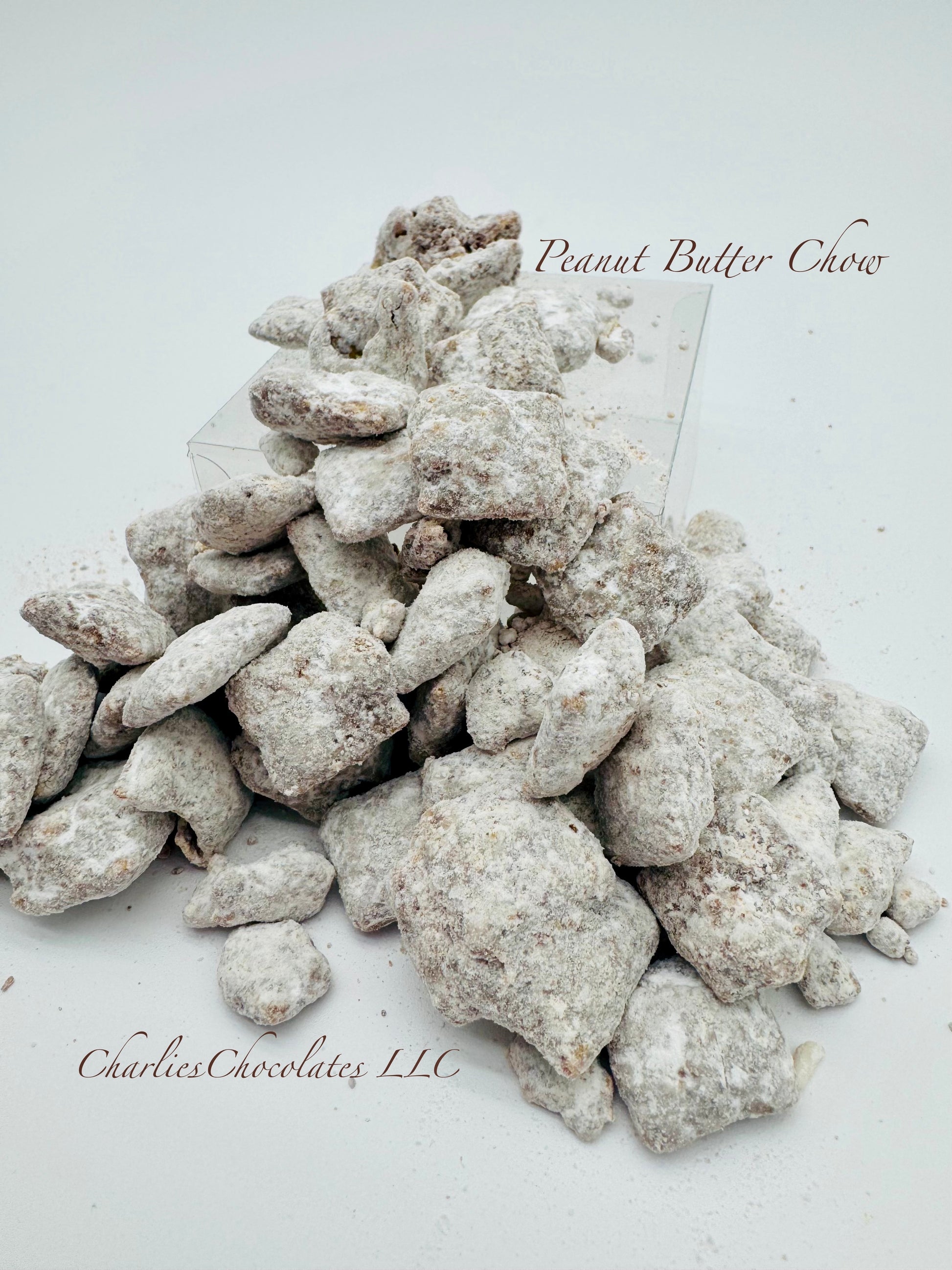 Rice chex cereal made with fresh peanut butter mixed with a custom blend of chocolates, then tossed in powdered sugar!