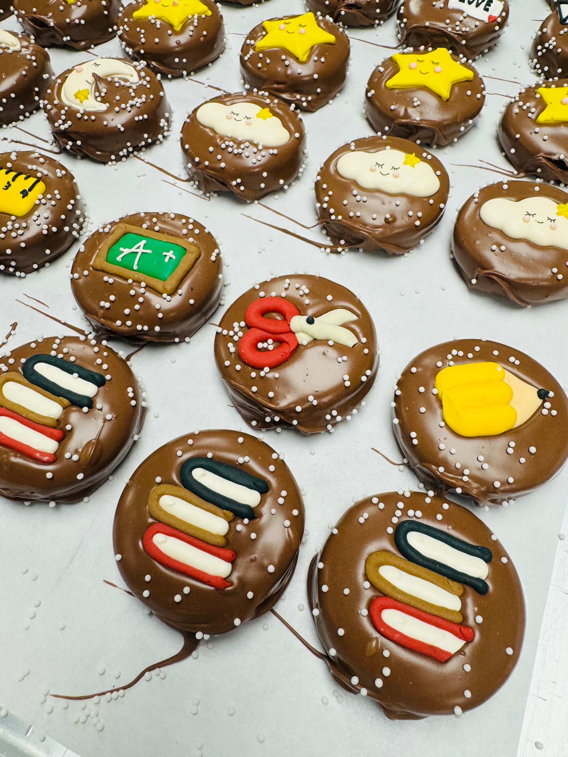 Oreos hand dipped in decadent milk chocolate and decorated with edible Royal Icing.Decorated Oreos can be Individually packaged or packaged in Doubles.